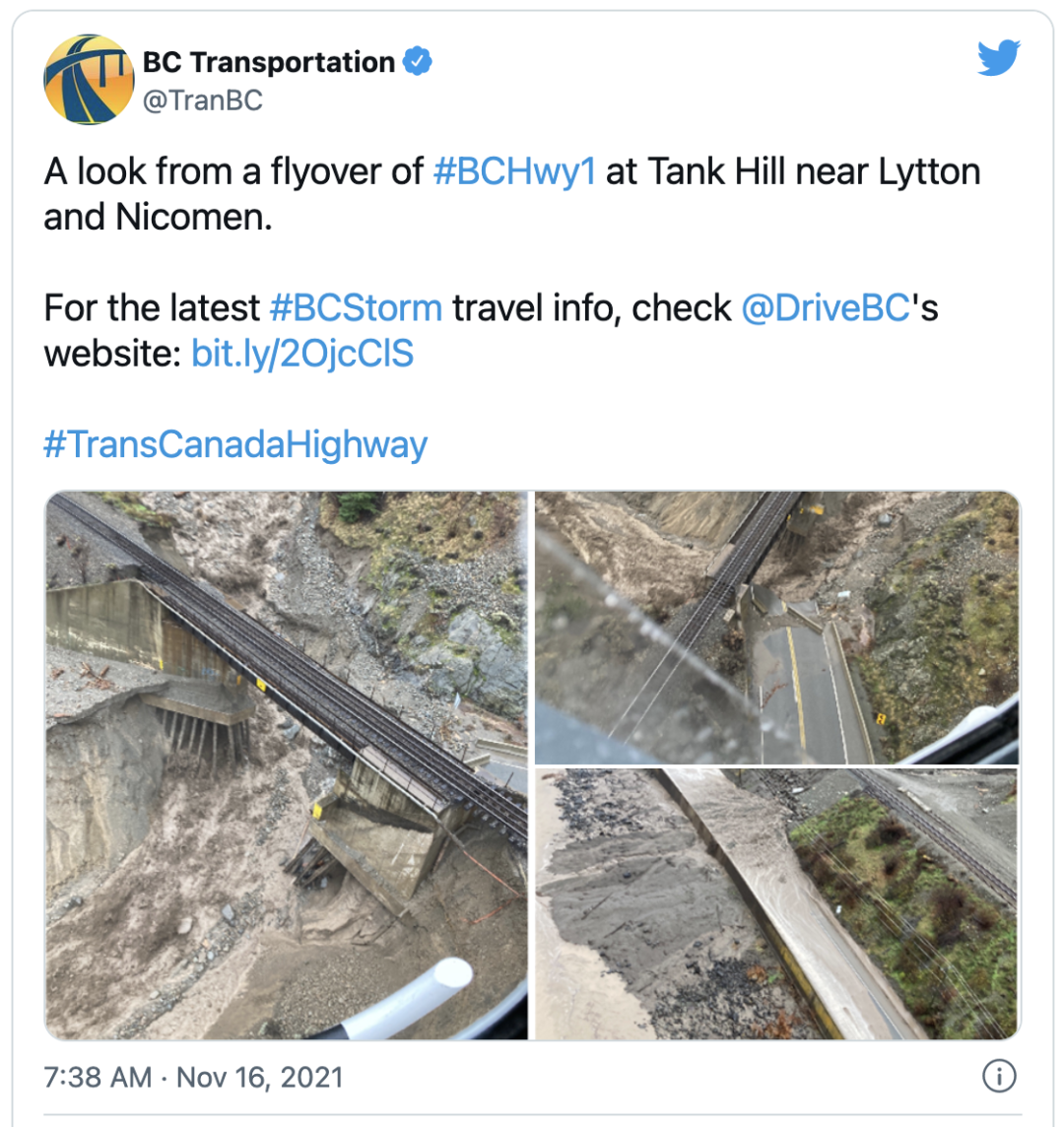 由于泥石流和大滑坡,BC省各地高速公路也依旧处于关闭状态,Coquihalla 及 Trans-Canada间的部分路段已被汹涌的河流冲垮。数百名司机被困在道路上,许多人在周一被直升机勉强搭救走。