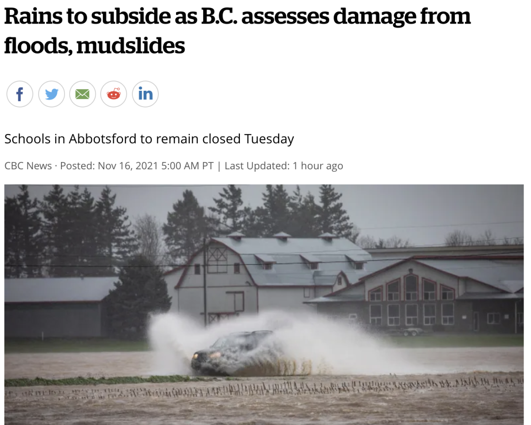 11月16日消息,Abbotsford市学区取消了所有课程,该市部分地区仍下达防控洪水的疏散命令。