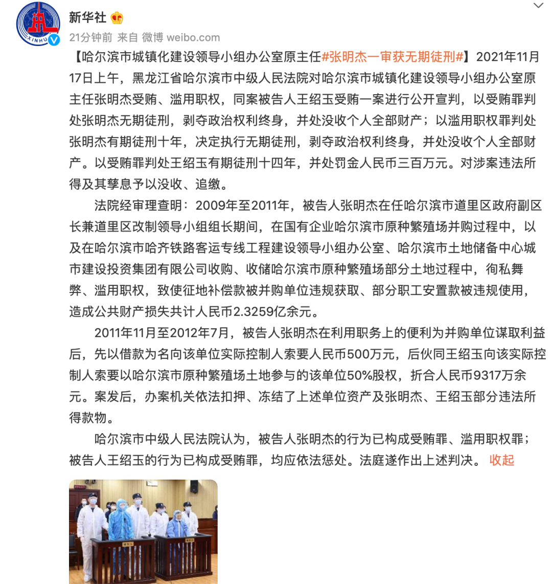 2021年11月17日,对哈尔滨市城镇化建设领导小组办公室原主任张明杰受贿、滥用职权,同案被告人王绍玉受贿一案进行公开宣判。