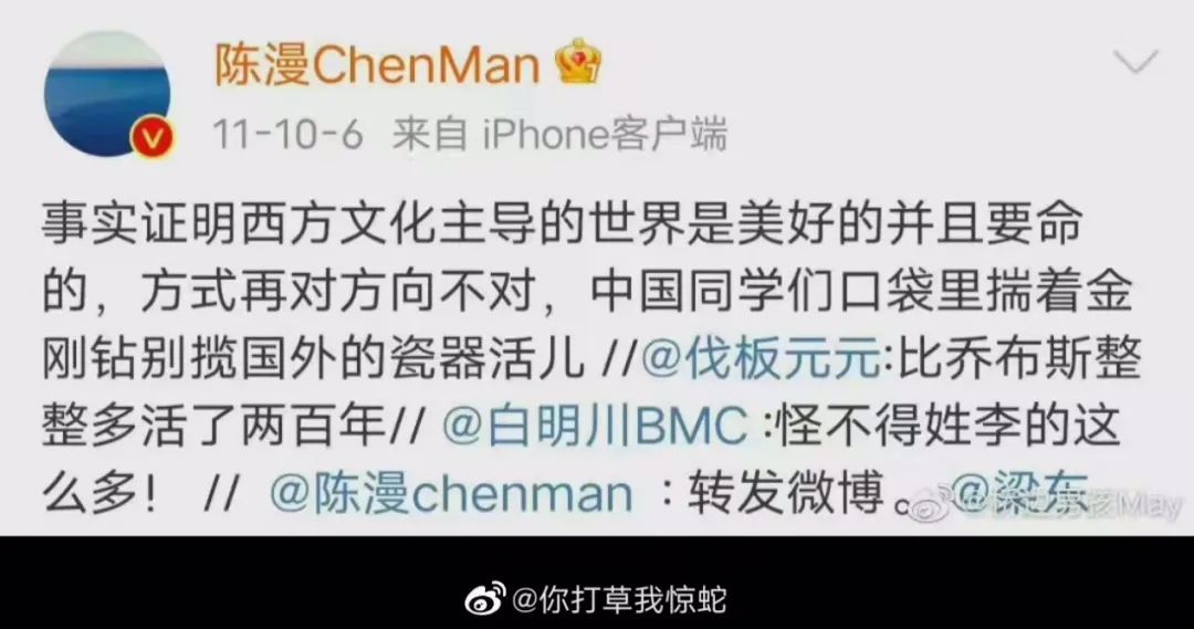 西方这个坐标系在现实当中日益崩塌,而半殖民地半封建的畸形文化在一些人头脑中仍未全然散去。在未来的道路上,这些膝盖软脑袋空的人不但带不了头,还要远远的掉队。