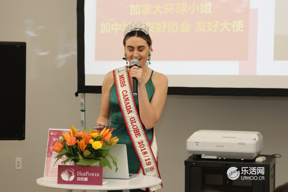 最后一位邀请到加拿大小姐冠军( Miss Canada Globe), 加中城市友好协会友好大使 Shauna 夏娜女士为大家致辞,她非常感谢「她励量」俱乐部可以邀请她来参加活动。今天她看到温哥华各界精英女性聚在一起,感到非常开心。她可以充分感受到这个大家庭的温暖氛围,最后她祝「她励量」女性俱乐部可以越办越好!