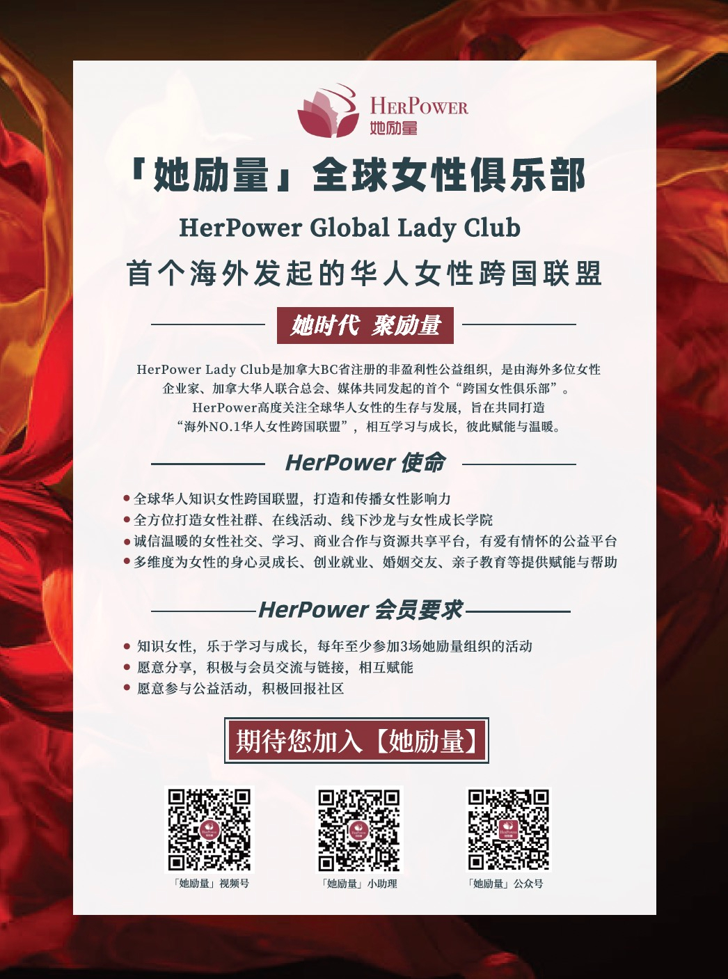 HerPower Lady Club是加拿大BC省注册的非盈利性公益组织,是由海外多位女性企业家、加拿大华人联合总会、媒体共同发起的首个 “跨国女性俱乐部”HerPower高度关注全球华人女性的生存与发展,旨在共同打造“海外N0.1华人女性跨国联盟”,相互学习与成长,彼此赋能与温暖。