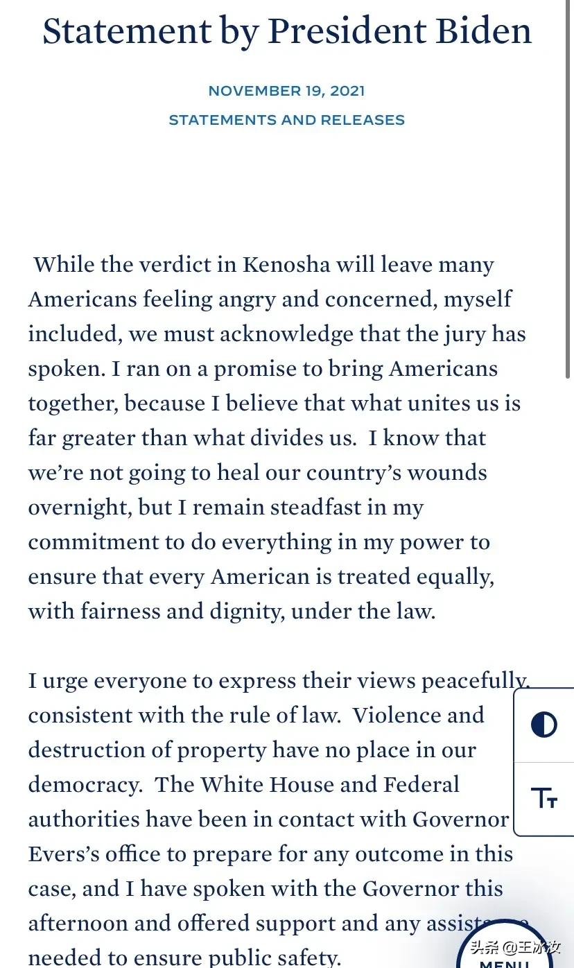 五项罪名全部被推翻,里滕豪斯被当庭释放的结果,让受害者家属,以及很多美国人意难平。拜登发表声明写道:基诺沙的判决让很多美国人感到愤怒和担心,包括我自己。但我们必须承认,陪审团已经作出决定。拜登敦促所有人和平、合法地表达观点,绝对不会容忍暴力与破坏财产的行为。