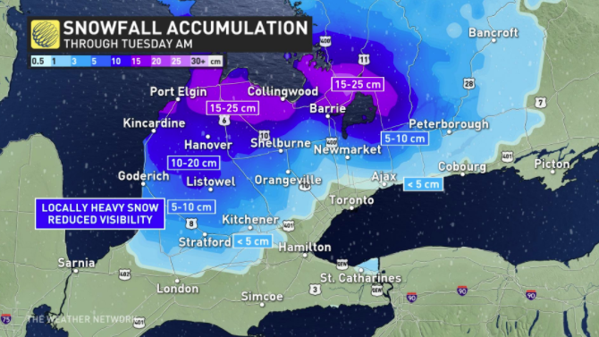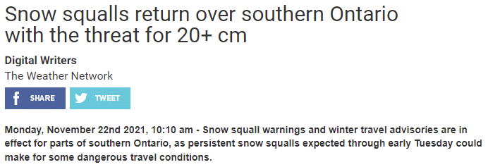 据天气网络(The Weather Network)报告,“安省部分地区会因为湖面效应而在本周遭遇雪飑(snow squall),并预计在周二时产生15至30厘米积雪。”
