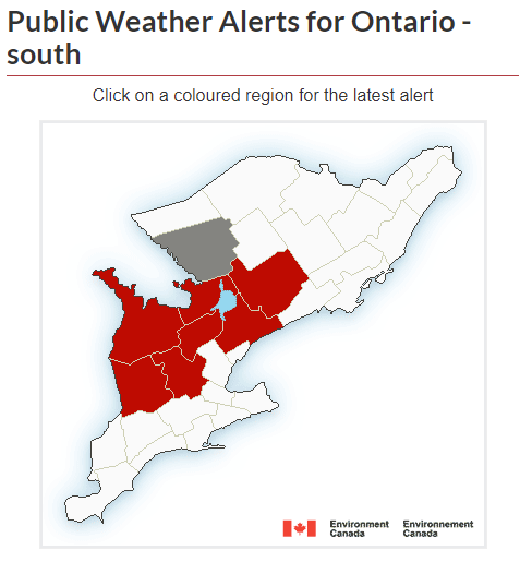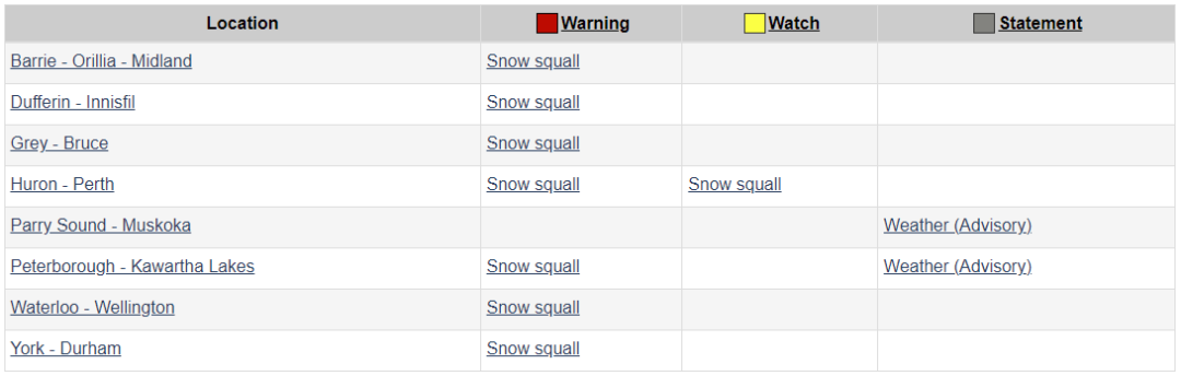 今天(11月22日)上午,加拿大环境部对安省发出雪飑警报的地区包括:Barrie-Orillia-Midland一带、Grey-Bruce一带、Parry Sound-Muskoka一带、Waterloo-Wellington一带等七处。
