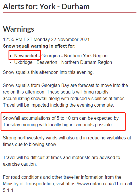 另外,环境部在今天8点44分时对大多区内的Dufferin-Innisfil和York-Durham一带,发布了雪飑观测警报。包括Newmarket至约克区北部等地区有可能在今天下午时段出现雪飑,直到夜里,降雪量预计为5到10厘米。