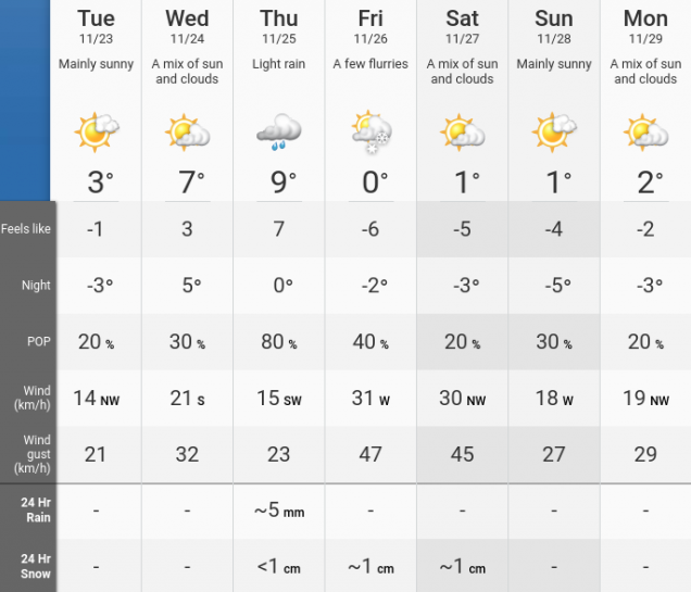 周五和周六连天可能会有1厘米左右的降雪。天气网络还表示,周五时多伦多一些地区的风速会达时速47公里。