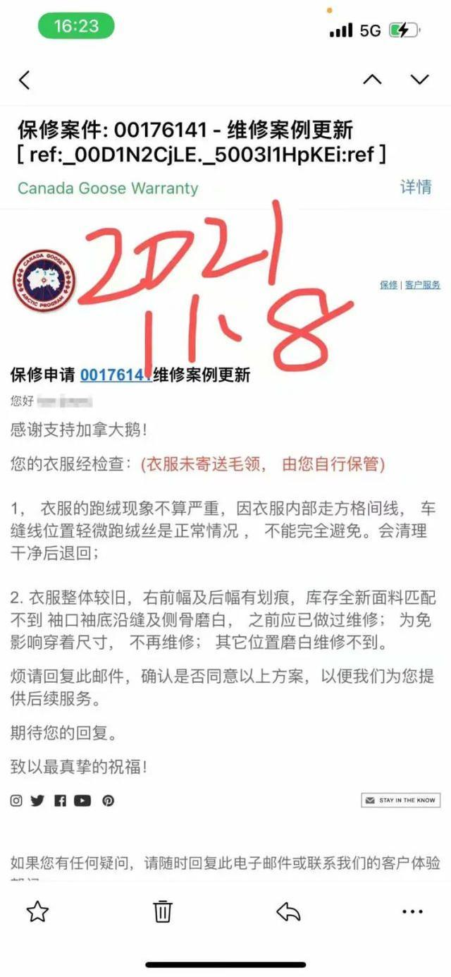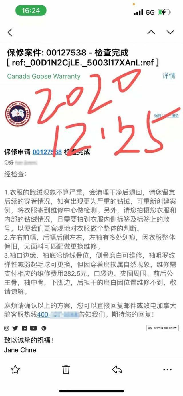 见此,韩女士想可能是衣服跑绒了,便直接申请了加拿大鹅的了“全球终身保修”服务,随后将羽绒服寄到了保修点进行维修。
