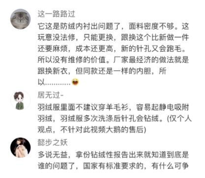 还有专业网友指出:防绒内衬出问题,怎么修都没办法!