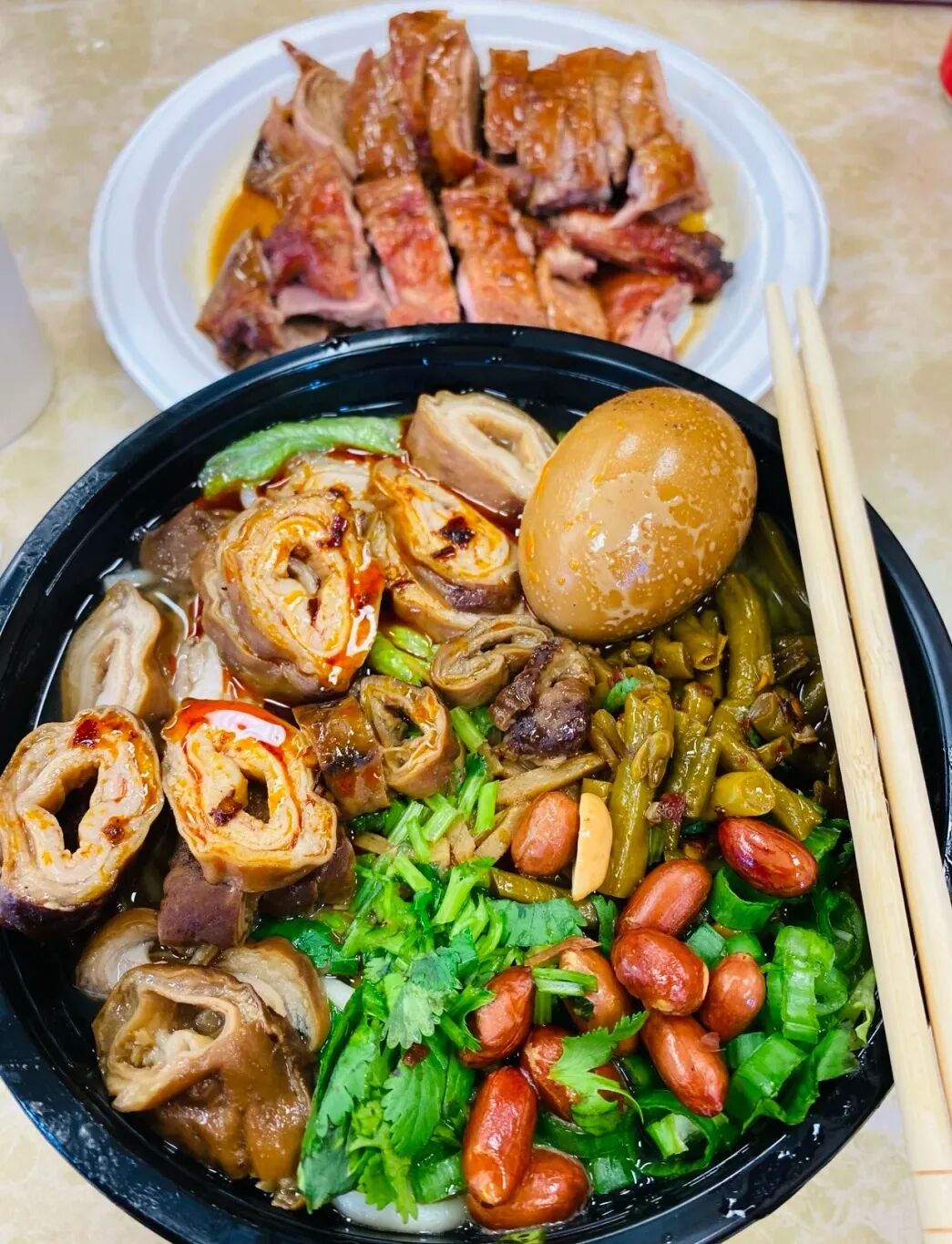 9刀的肥肠粉,量大料足,有木耳,腐皮,酸豆角,笋干,花生米,黄花菜等,再配上贵妃鸡烧鸭和一个卤蛋,简直太完美了!