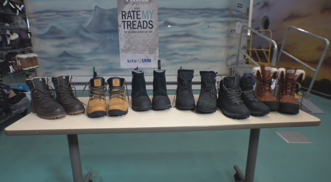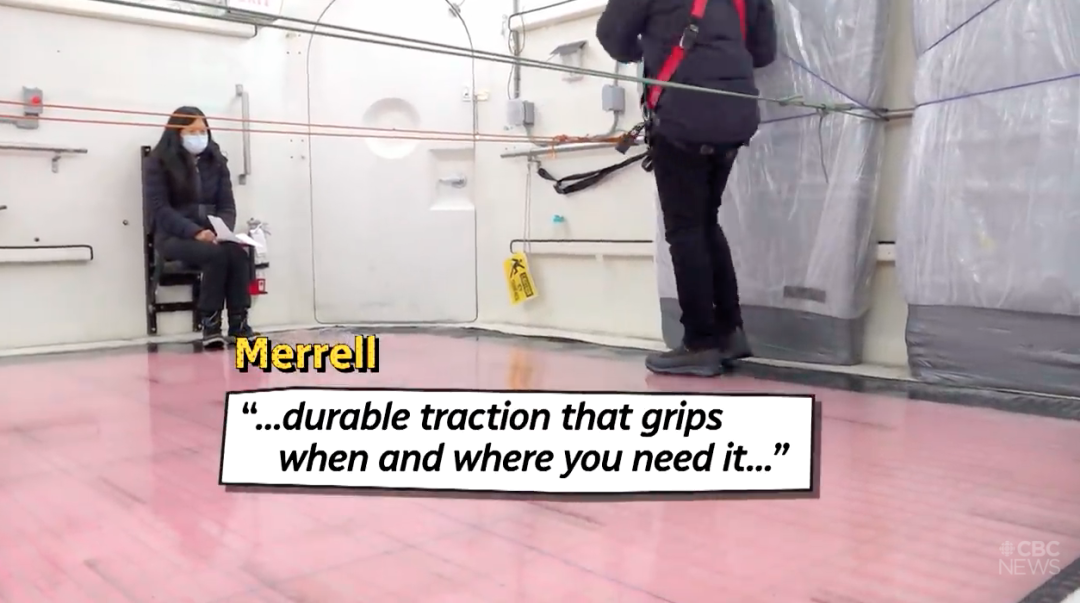 CBC Marketplace团队到多伦多的KITE研究所,对市面销量最好的6双鞋子分别进行了防滑测试,评估每双靴子可承受的最大倾斜程度MMA。(越防滑的靴子,可承受的倾斜程度越大)