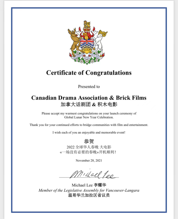 BC省议员李耀华在贺辞中除了用中文表达了“恭贺 2022全球华人春晚大电影《一场没有必要的春晚》开机顺利”,他在英文中也写道“”感谢加拿大话剧团和积木影业以电影和文艺的形式,持续为社区的沟通和发展起到了桥梁作用。”