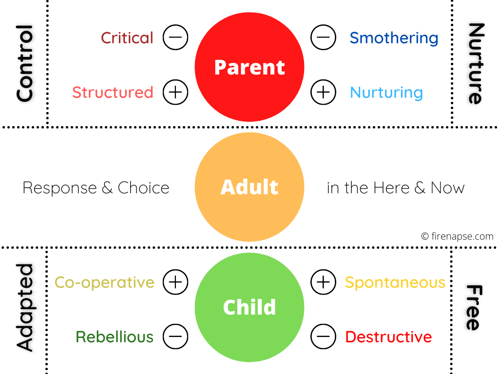 每个人都曾经是小孩,我们会重复我们小的时候的状态;我们都有父母,我们都会模仿他们在养育自己时候的想法和行为;我们也都是一个头脑发育正常,受过基础教育及社会规则约束的成年人。在不同的情境下,我们会选择在父母的状态-年幼的自己-成年的自己三种状态中来回切换。