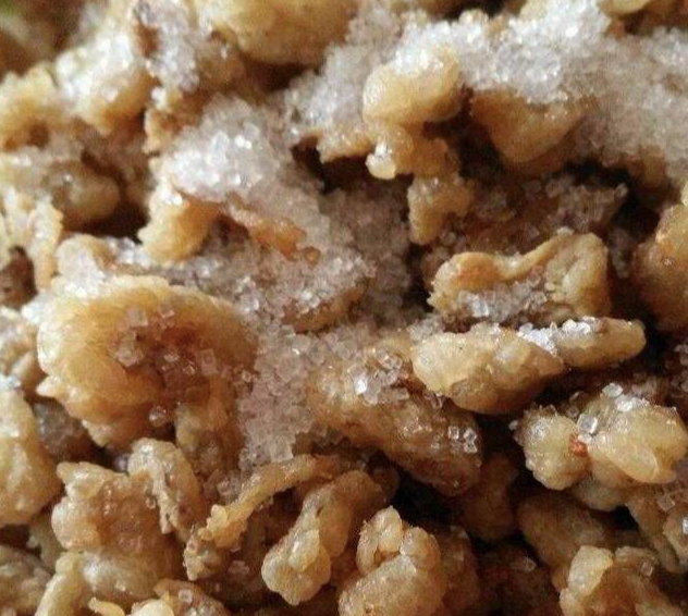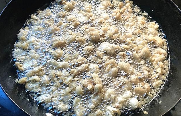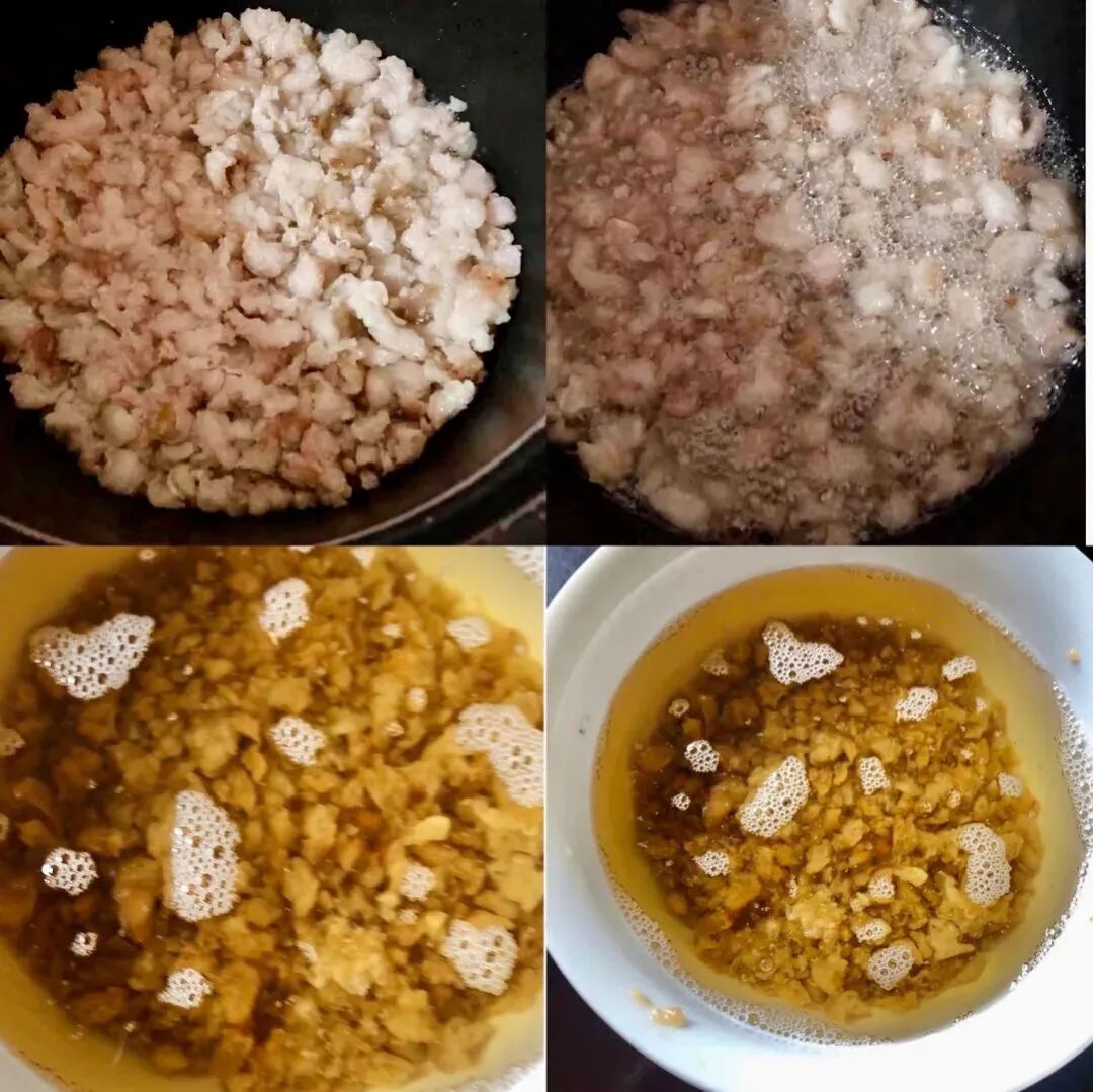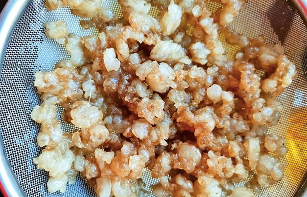 猪油渣属炼猪油的副产物,吐出最后一口油后又在锅里被油反哺,说起来很奢侈,几乎就是在用油炸油,如同拿水洗水般讲究。