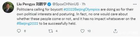 值得注意的是,美国当地时间6日,刘鹏宇在个人推特上也公布了类似内容。刘鹏宇批评美国政客鼓动抵制冬奥会只是为了他们自己的政治利益,故作姿态。