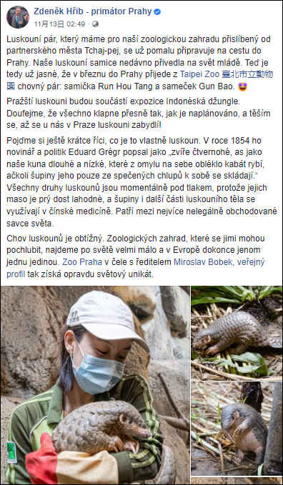 在注定无法迎来大陆的大熊猫后,贺瑞普替布拉格要到了来自台北的穿山甲。11月13日,贺瑞普在脸书上贴出一对穿山甲照片,宣布明年3月这两只穿山甲将从台北运抵布拉格。他还极力吹嘘穿山甲的独特性,称因为很难养殖,全欧洲只有一家动物园拥有穿山甲,而即将拥有穿山甲的布拉格动物园将变得“独一无二”。