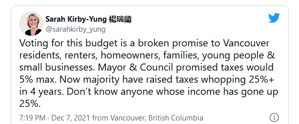 上个月,政府一度表示物业税增幅会控制在 5% 以内,结果最后出来的 6.35%,高出了足足1.35%。投票结束后,温议员杨瑞兰很快就在网上发文表示,投票支持这项预算通过的人是对温哥华居民、租房者、房主、家庭、年轻人和小企业违背了承诺。此前,市长和市议会承诺最多涨 5%。现在大多数人在 4 年内增加了高达 25% 以上的税收。事实上,又有谁的收入增长了 25%呢。