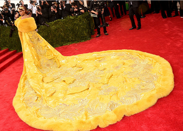 2015年,蕾哈娜一身中国风的龙袍大裙亮相时尚奥斯卡Metball红毯,