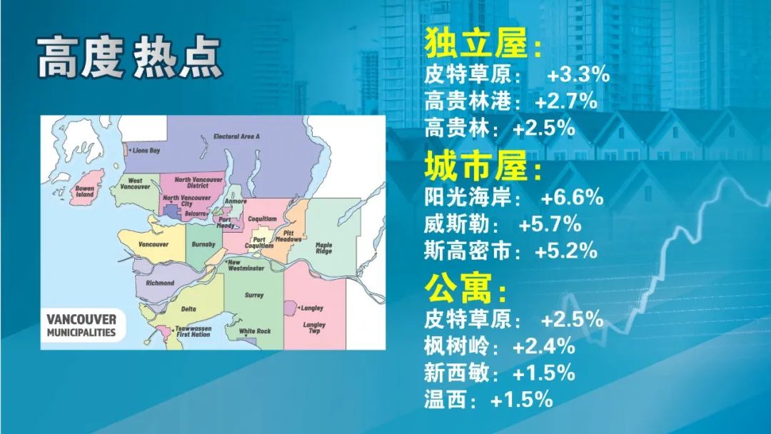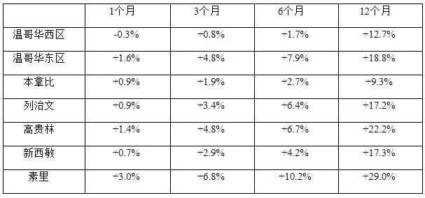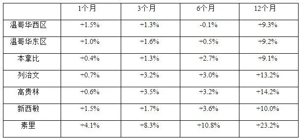 但在任何市态中,不同房型不同城区和社区都应该有涨跌互现的情况。例如,斯高密市、阳光海岸、威斯勒的公寓市场在过去的1个月内表现极差,分别下跌了4.2%,3.7%,3.0%,此外,阳光海岸的独立屋也下跌了2.2%,温哥华西区和西温哥华的独立屋也分别下跌了1.1%和1.0%。