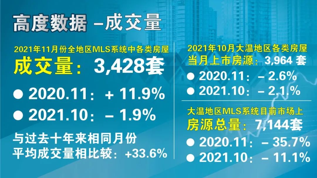 大温地区房地产协会经济学家Keith Stewart对11月份的市场评述如下:“我们可以预期的是,到今年年底全地区全年度的房屋成交总量将达到有史以来的最高点。在2021年房屋上市总量一直偏低的情况下,成交量却在大幅提高。新的年度即将到来,房屋的上市量将进一步成为焦点,因为这决定着全地区房屋的可负担性”他继续说道:“市场的供需失衡,加之房屋买家要充分利用目前的房贷利率低位,这些都新的年度即将到来,房屋的上市量将进一步成为焦点,因为这决定着全地区房屋的可负担性。”