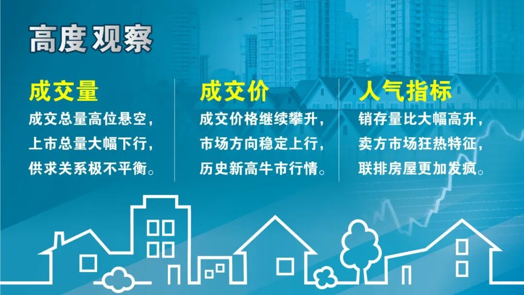 第三条的内容是:销存量比大幅高升,过去几个月来销存量比一直维持在百分之三十几的高位,6月34.7%,7月33.8%,8月35.0%,9月34.1%,这都处于极热的卖方市场状态,到了10月份我们看到了43.5%这样一个高点,11月份更是达到了48.0%这样一个超级高点。其中城市屋的销存量比居然达到了74.3%这样一个极端的历史最高位,在老张从业的20多年中没有见过这样高的销存量比,堪称叹为观止!这就构成了卖方市场狂热特征,联排房屋更加发疯。目前的市场就处于这样一个超级卖方市场。