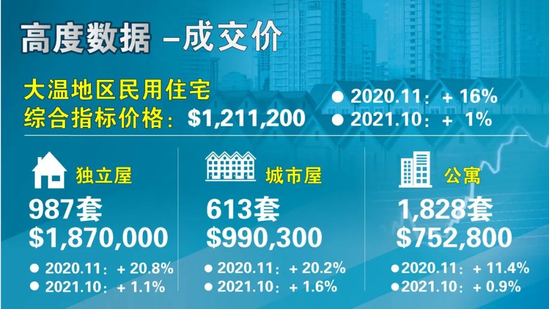 在成交价方面,大温地区民用住宅MLS房屋价格指数的综合指标价格现在是$1,211,200,比去年同期上涨了16.0%,与上个月相比价格上涨了1.0%。在各类房型中,目前全地区独立屋的指标价格为$1,870,000,比去年同期上升了20.8%,过去一个月上涨了1.1%;公寓的指标价格为$752,800,比去年同期上涨了11.4%,过去1个月来价格上涨了0.9%;目前全地区城市屋的指标价格为$990,300,比去年同期上涨了20.2%,比上个月上涨了1.6%。