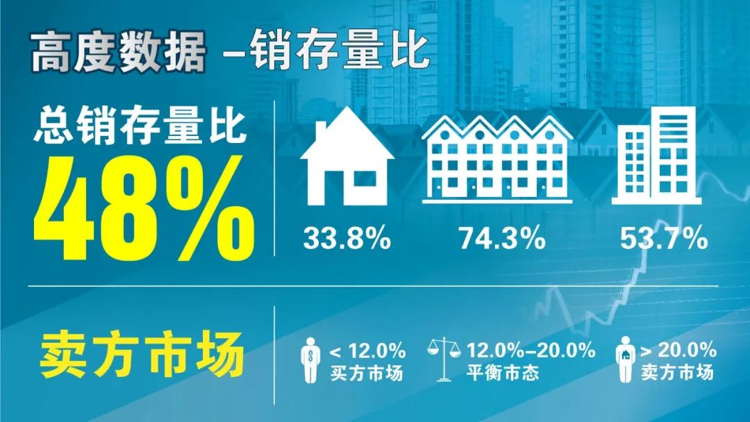 一般来说,确定一个市场是否买方、卖方、平衡状态要有至少3个月的数据支撑。温哥华地区的房地产市场目前已经全方位地处于“卖方市场”。从去年6月份的市场总销存量比(当月的成交总量与市场的房源总量之比)突破20%之后,在6个月之内维持在20% – 30%之间,从去年的12月份开始,销存量比一直维持在30%以上的高位区域,这些强劲的销存量比的数据表明,我们已经有了18个月强有力的数据支撑,市场已经连续18个月维持着很高的人气指标和成交比例,已经连续18个月处于纯粹的、罕见的、长期的“卖方市场”。