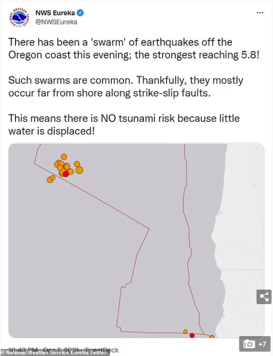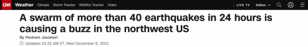 12月7日早上,美国俄勒冈州波特兰附近的海域发生了40多次地震,震级为3.5-5.8不等。