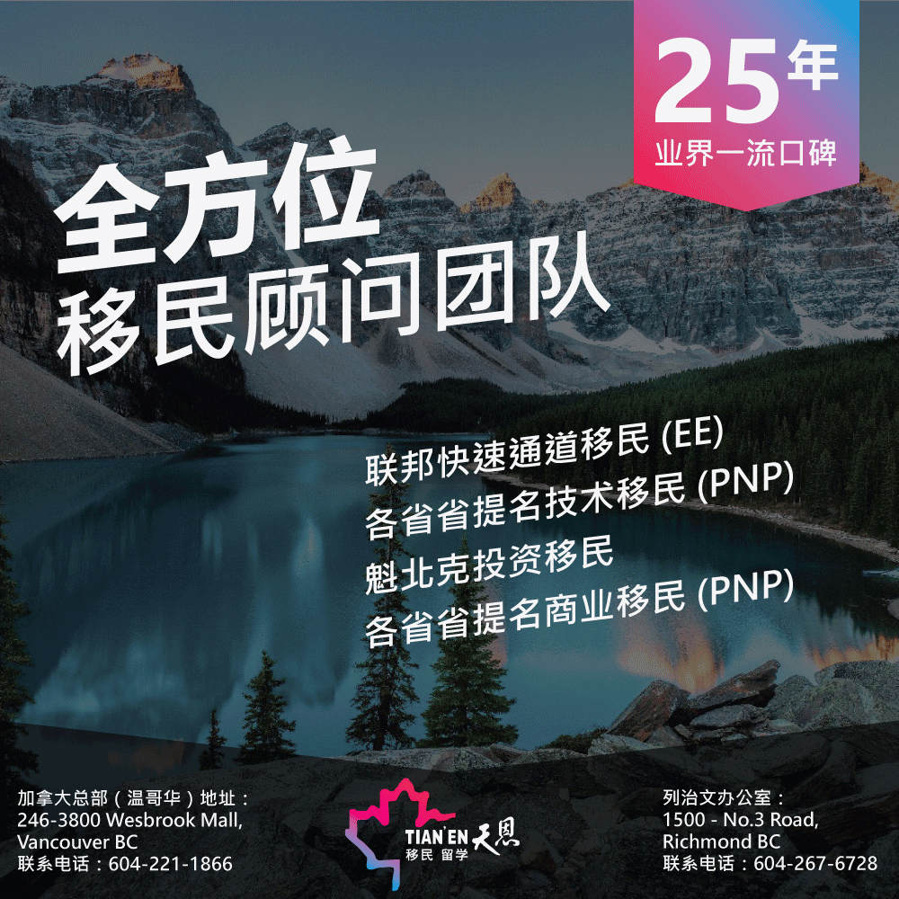 。天恩集团秉承精益求精的理念,屹立于行业25年,从移民留学、投资创业、技术工签、签证服务、延展到海外安家 、海外投资规划、海外置业规划等服务,是实现加拿大生活规划的一站式专业服务机构。不仅为高净值人士提供定制化方案,同时深耕于温哥华的高等学府,聚集各类优质资源,搭建企业与学生之间的桥梁,以高效务实的服务在业界拥有一流口碑。
