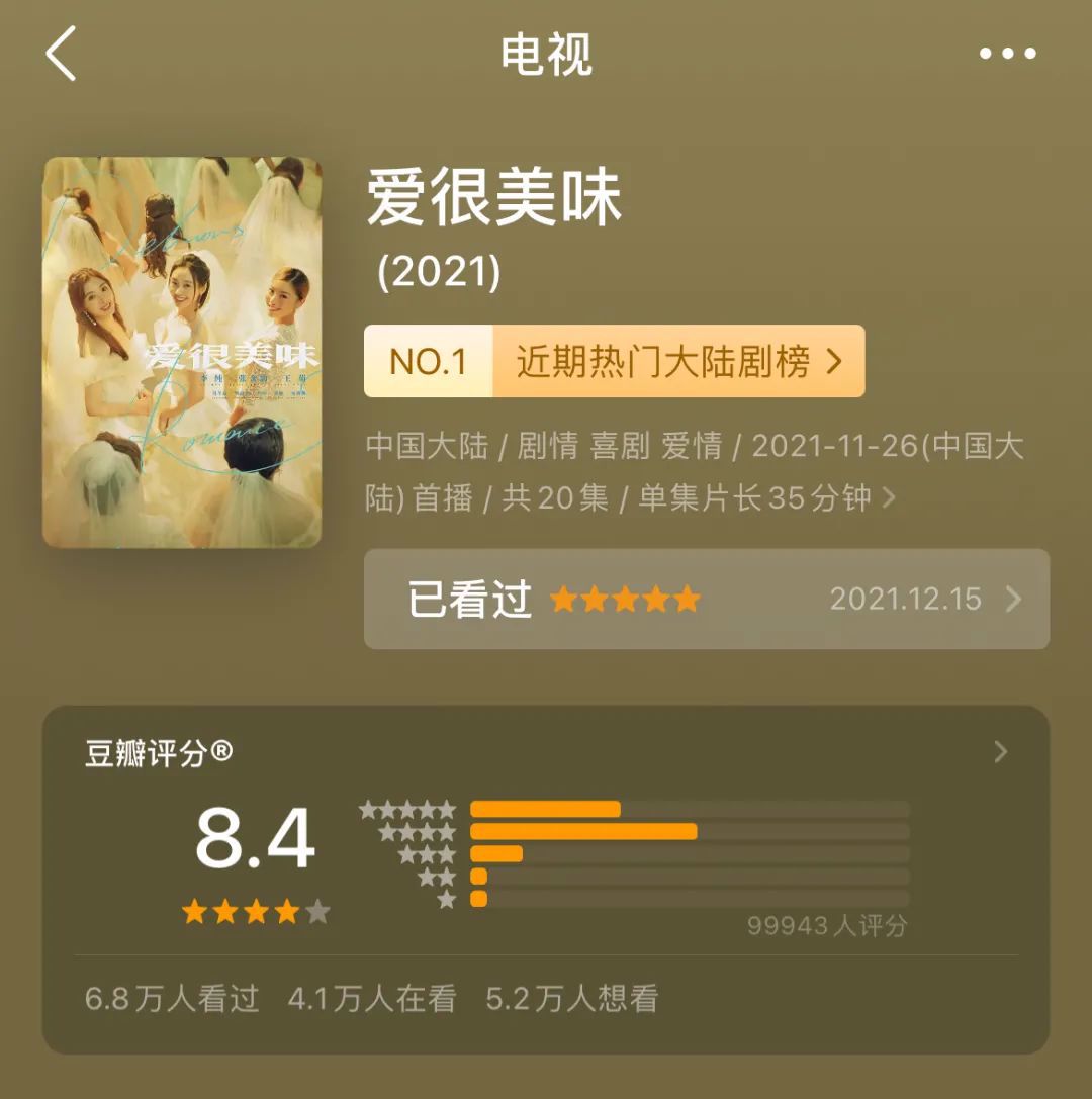 为啥说它是小破剧呢?前期无宣传,剧中无大牌,男演员们的颜值还很真实……豆瓣评分全全凭自来水们真情实感地打出来地,一路从开播的 8.1 升到了 8.4!完胜同时期、同类型的各大热门国产剧集呢。《小敏家》7.5;《三十而已》6.6;《欢乐颂1、2》分别是 7.4 和 5.4。
