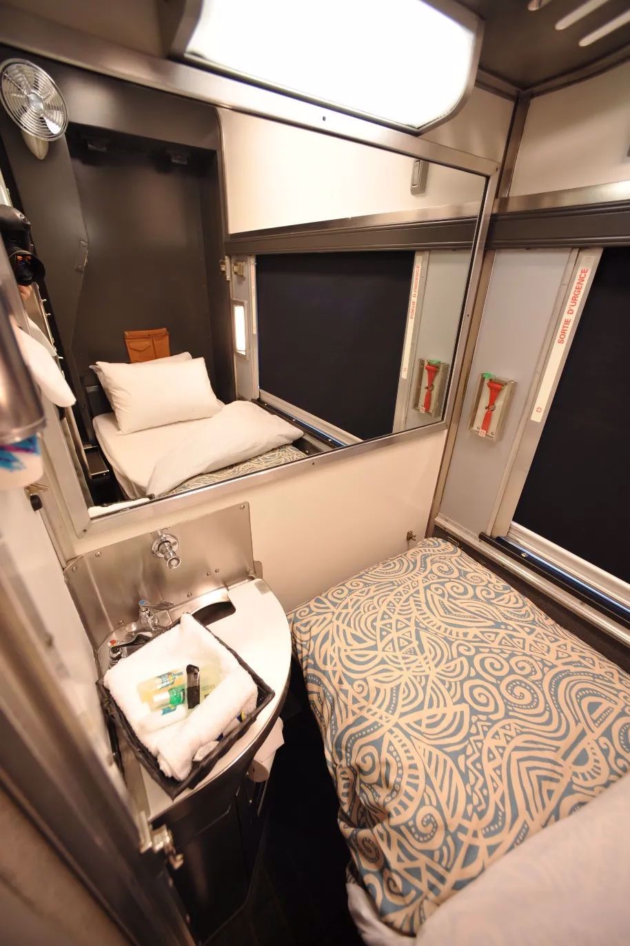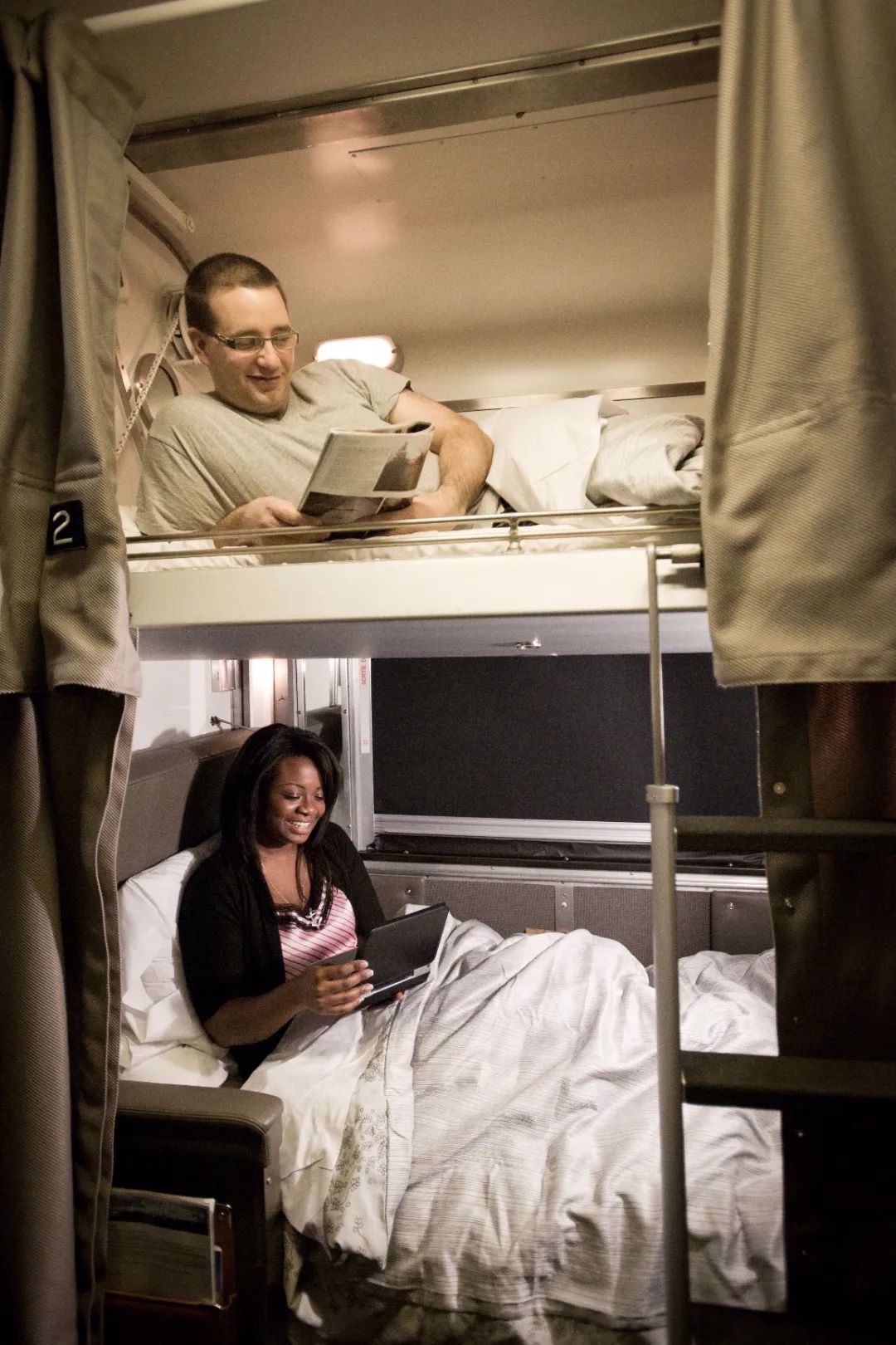 白天是开放式面对面的两个沙发座位,晚上转变为带独立遮挡帘子的上下铺单人床位,使用公共洗手间及淋浴。