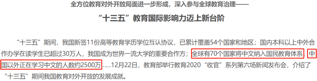 “十三五”展示了我国在“国际中文教育”发展上的成就,全球有70个国家将中文纳入国民教育体系,中国以外正在学习中文的人数约2500万……