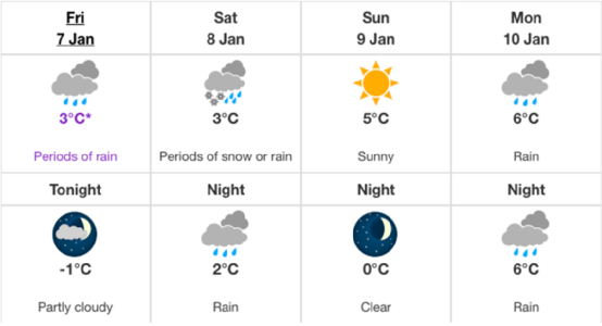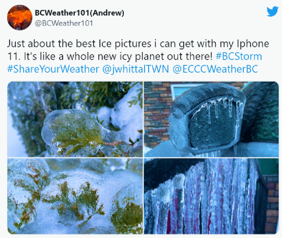 (图自推特)不过,1月7日的大风似乎也将为近期大温地区较为异常的冬季天气划上暂时的休止符。除了7日晚间气温仍会达到-1摄氏度外,之后几天的气温基本都在零上。而从下周一(1月10日)开始,温哥华将重拾“雨哥华”的头衔。