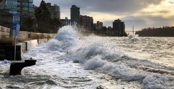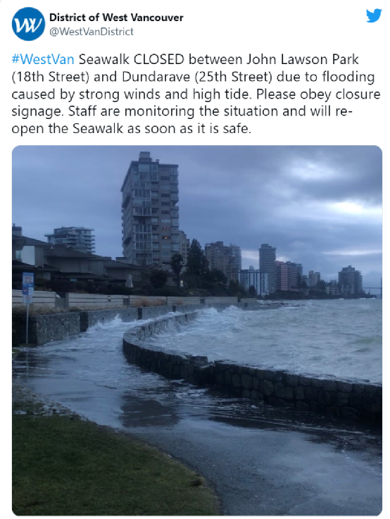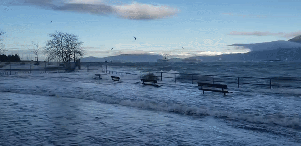 (图自Daily Hive)然后西温的海堤直接被洪水给淹了,一个通常供行人使用的喷泉差不多有一半都泡在海水里,海浪直接越过海堤,一路冲到海滨公园的草坪上。