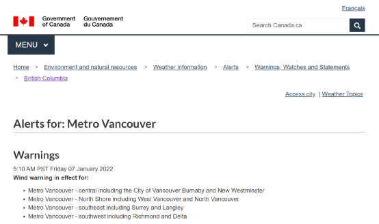 (图自加拿大环境部)“强风可能会吹起松散的物体或导致树枝折断,”讲道理,加拿大环境部警告中的措辞算是比较委婉的——住在列治文的小编家旁边有一排十几米高的大树,今天一上午这排树压根儿就没停下来过,全给大风吹得摇摇晃晃的:细碎的树枝被吹掉了一地,枝头仅剩的“幸运儿”疯狂地敲打着玻璃,让程序心惊胆战地敲下了这行字。
