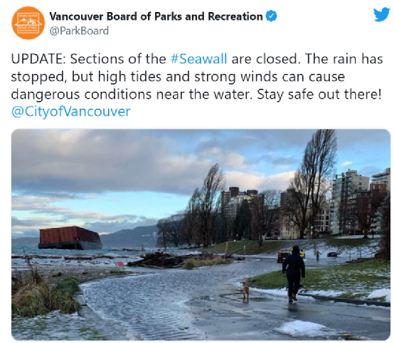(基斯兰奴海滩 图自推特)温哥华市政府直接关闭了日落海滩(Sunset Beach)附近的部分海堤。