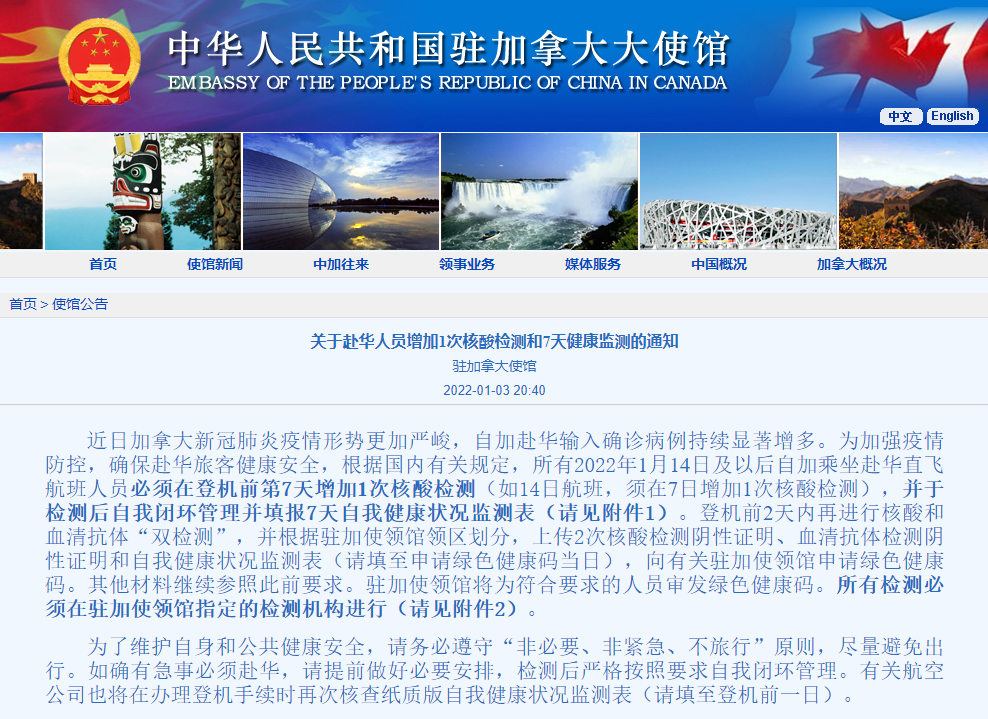 中国驻加拿大大使馆1月3日发出通知,对回国的核检等要求做出重要更新。对于赴华人员增加了1次核酸检测和需要7天健康监测。