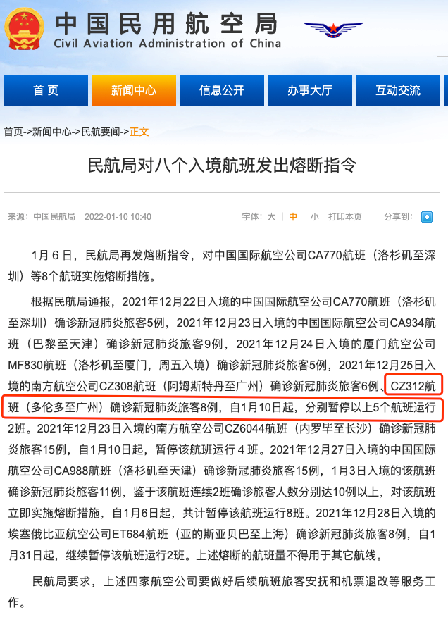 中国民航局1月10日对八个入境航班发出熔断指令,包括南航多伦多飞广州的CZ312航班,从今天起停飞2班。