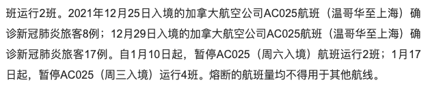 12月29日星期三,加拿大航空公司AC025航班(温哥华至上海)入境航班确诊新冠肺炎旅客17例。