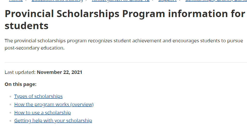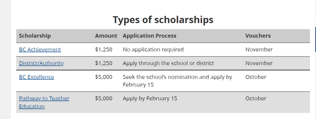 BC省省级奖学金分为四类:BC Achievement BC 省成就奖学金 ,District/Authority BC 省区域奖学金,BC Excellence BC 省卓越奖学金 ,Pathway to Teacher Education BC