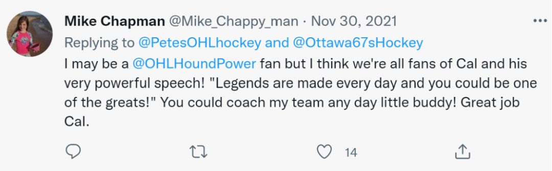 通过层层选拔,来自安省Lakefield年仅6岁的男孩Callan最终获得了主教练的职位,并与球队签订了为期一天的工作合同,在11月28日的比赛中担任Peterborough Petes队的主教练。