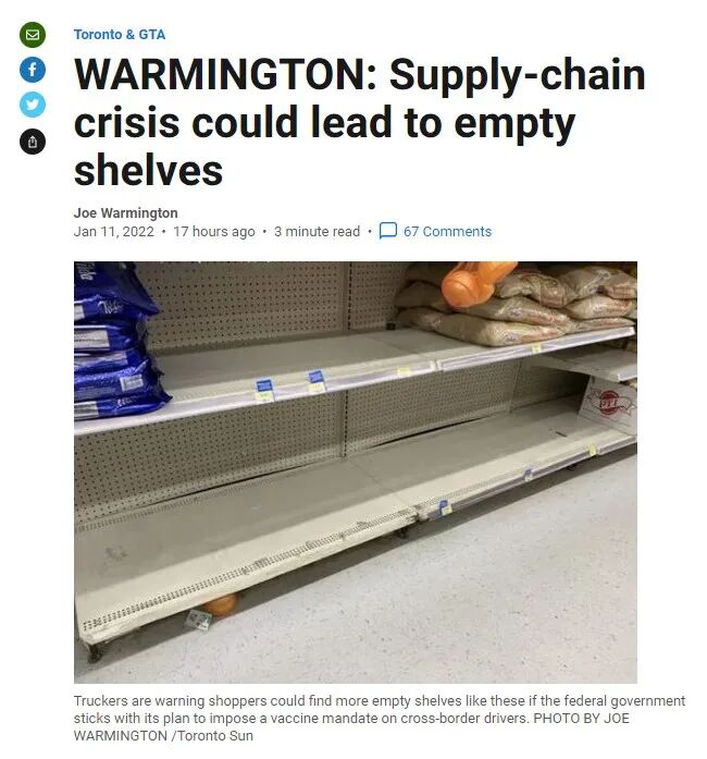据报道,这主要是由两个因素造成的,一个是Omicron变种的激增,另一个则是与加拿大1月15日起对卡车司机强制进行疫苗接种的新规有关。