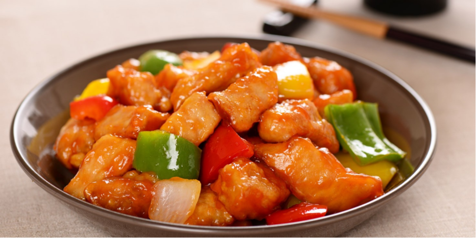 这道菜来自中国传统粤菜咕噜肉,做法是将猪肉调味后入油锅炸至酥脆,再粘上酸甜的酱汁,英文菜名直译过来就是“甜酸猪肉”。
