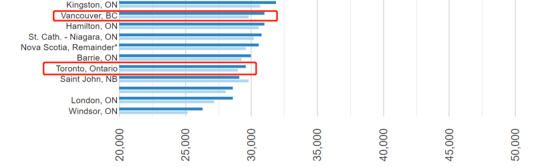 根据加拿大统计局数据,多伦多和温哥华等城市是移民收入最低的城市之一。2019年多伦多的工资中位数仅为$2.96万元,温哥华的收入中位数为$3.1万元。
