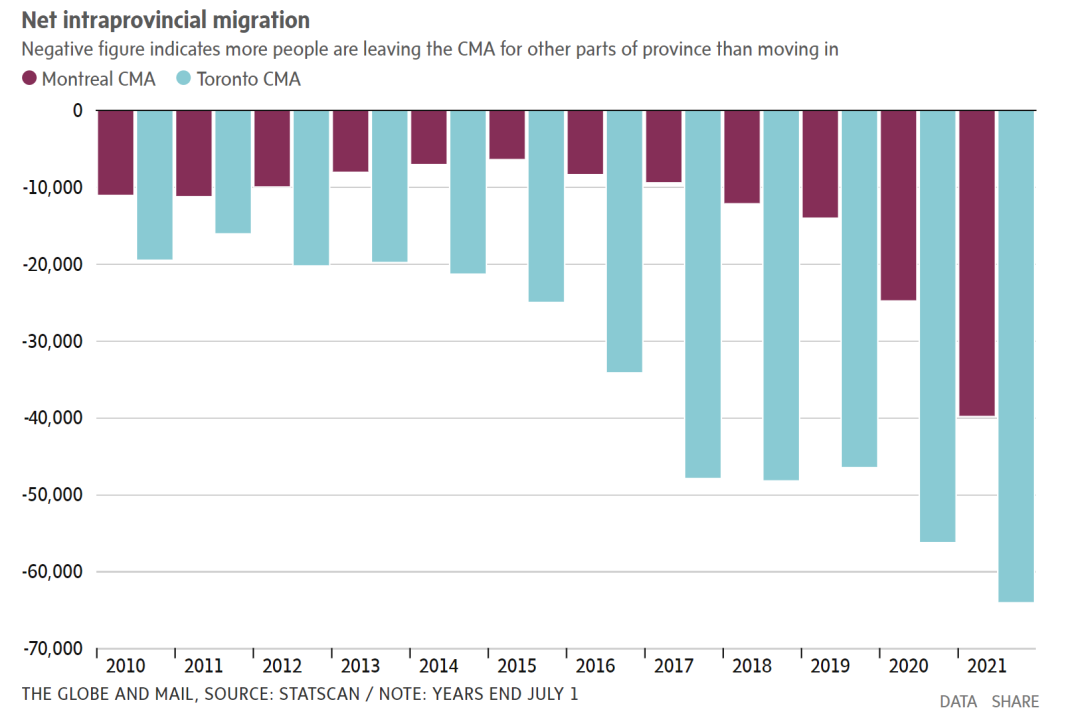 相反,省内移民的最大赢家是农村。魁北克农村(+25,831)和安大略省(+13,680)的净增幅最大。城市方面,奥沙瓦 (+8262) 和尼亚加拉 (+4945) 涨幅最大。同样重要的是,这些地方能够阻止人们逃离。