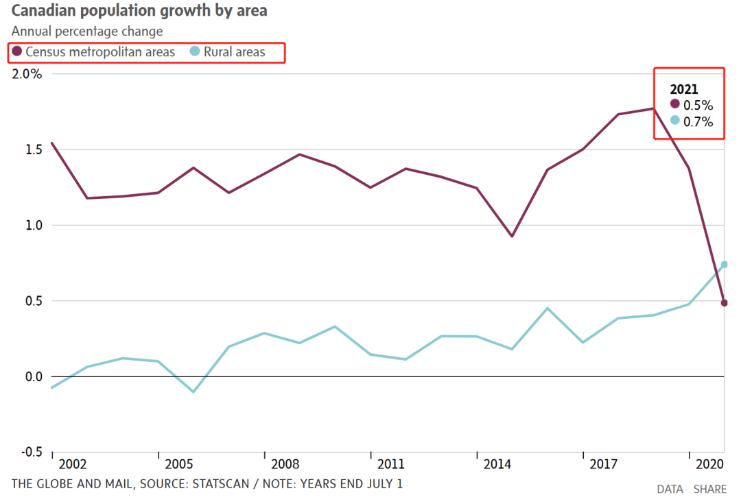 在全国而言,加拿大大都市地区(metro areas)的人口增幅仅为0.5%,农村地区(rural areas,人口不足1万人的地区)的人口增速为0.7%,首次超过了都市地区。