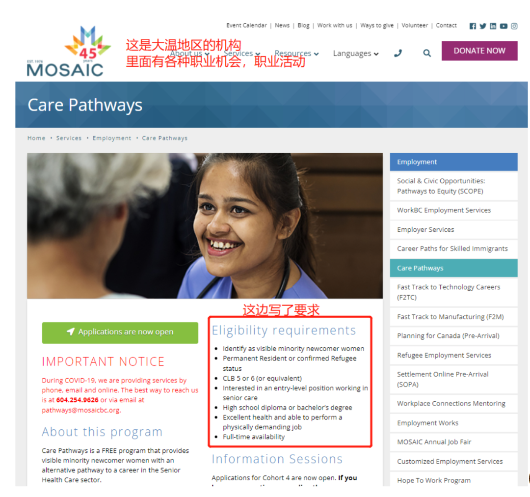 加拿大温哥华地区的MOSAIC举例,里面有各种求职相关活动和社交机会。