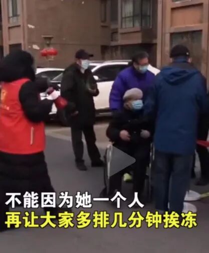 坐轮椅的老太太坚持要排队,不愿意别人因为她,再多受几分钟冻。