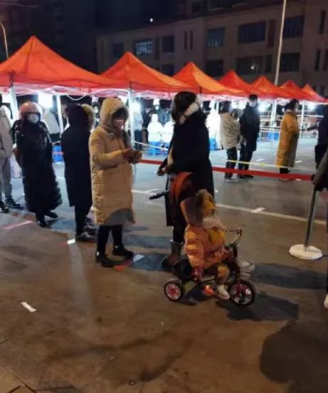两岁半的萌娃,不到5点就跟着家长排队做核酸。骑着自己的玩具自行车,安安静静地等待。