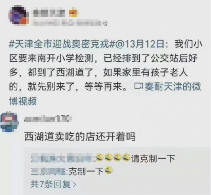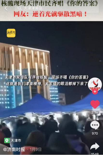 寒夜中,天津市民排队等待核酸检测,现场齐唱《你的答案》。